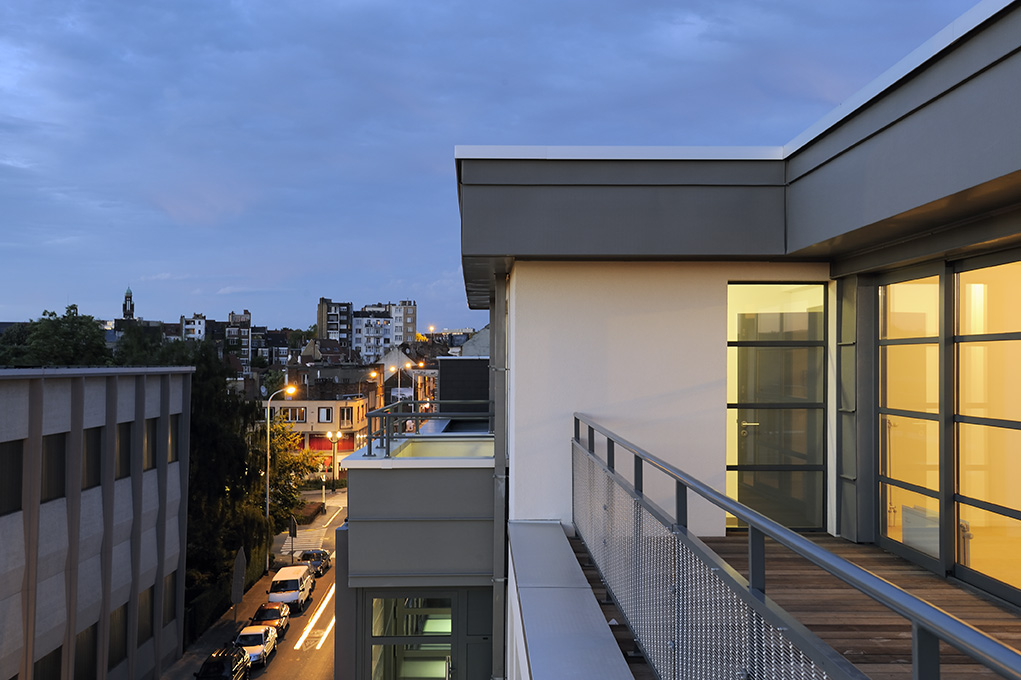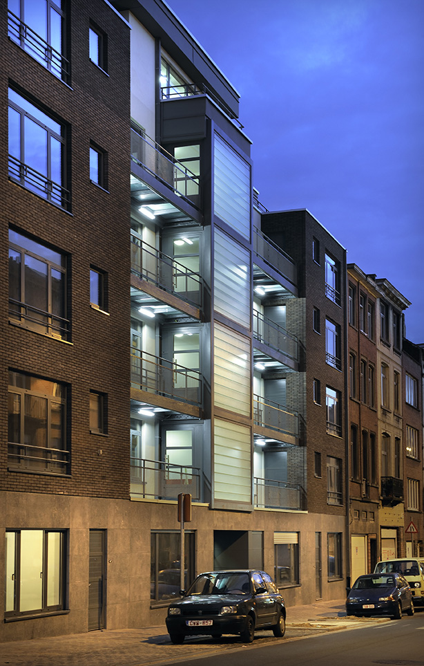 La transparence est un choix réfléchi pour le plan de ce projet, tant d’un point de vue fonctionnel que constructif. Il mise sur une utilisation optimale des superficies disponibles et une construction logique et univoque. Des choix qui influencent positivement le budget du projet. Les zones résidentielles contre les façades avant profitent pleinement de la lumière du jour. Les espaces fonctionnels qui n’ont que peu ou pas du tout besoin de la lumière du jour, sont installés au cœur, dans l’axe vertical du bâtiment. Ce volume central fait également fonction d’amortisseur entre les espaces de jour et de nuit.