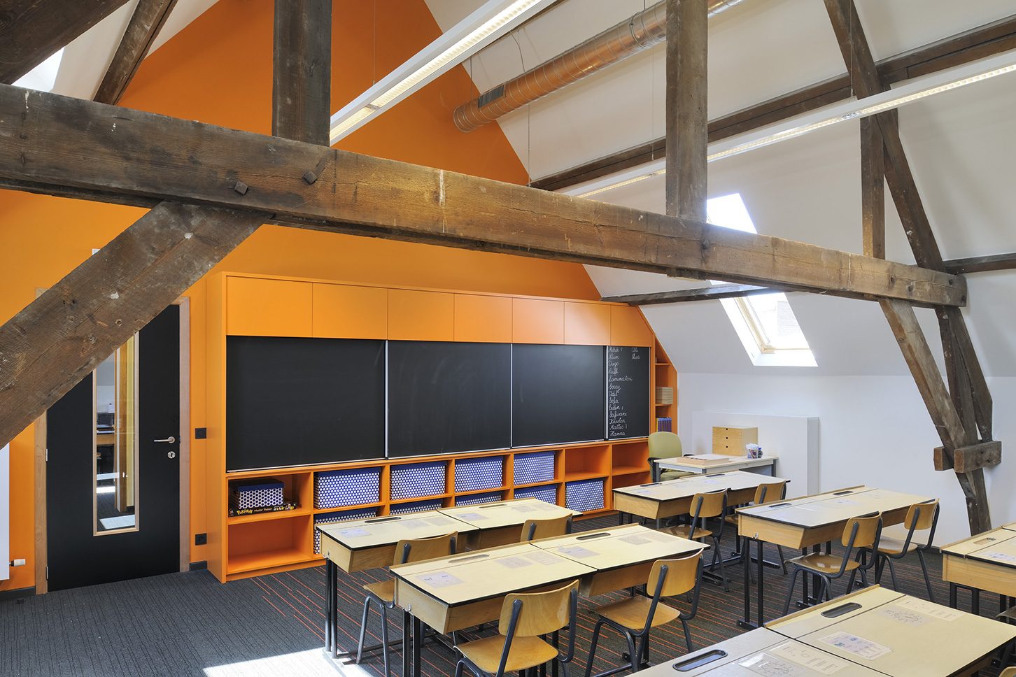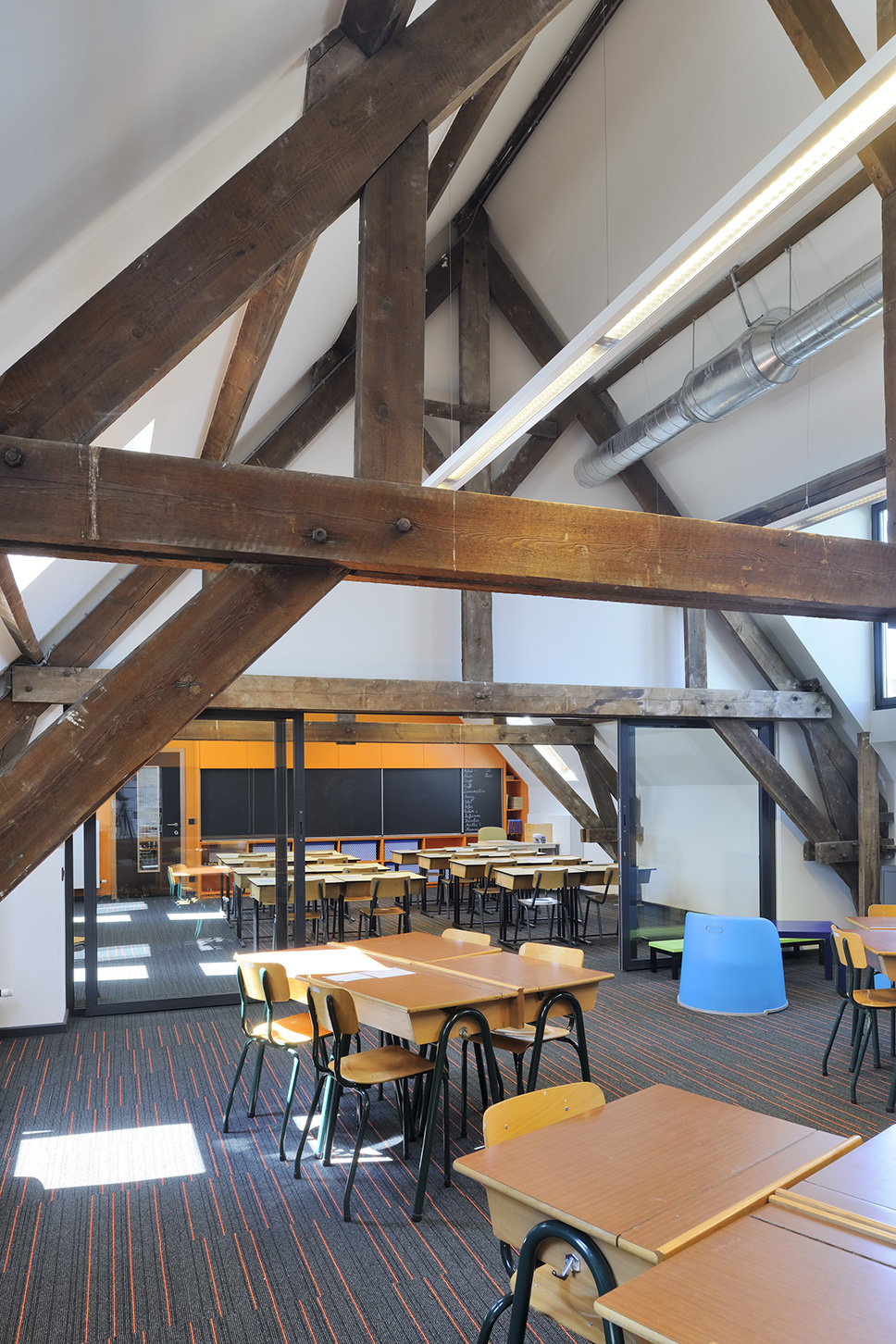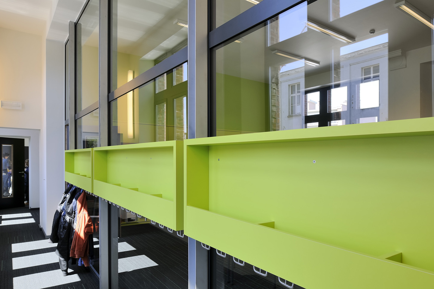 La rénovation du bâtiment existant avait notamment pour but de remettre en état la façade historique de grande valeur. Les espaces intérieurs ont également été repensés de manière contemporaine, avec une petite note ludique. Les couleurs du tapis se retrouvent sur les armoires murales. Une palette de coloris différente a été choisie pour chaque étage. Deux classes voisines peuvent être reliées visuellement et effectivement pour organiser des activités interclasses.