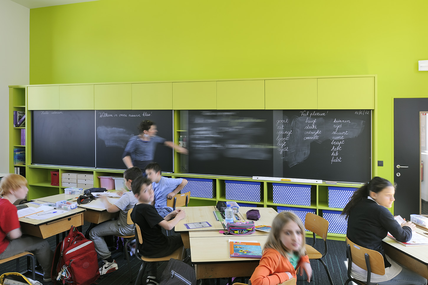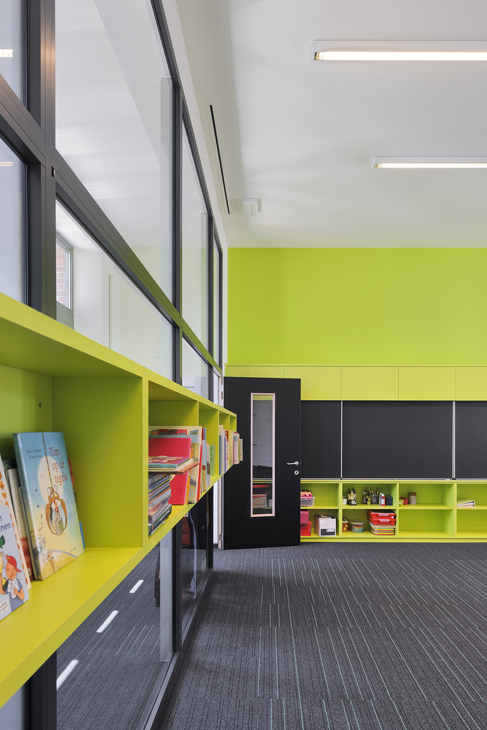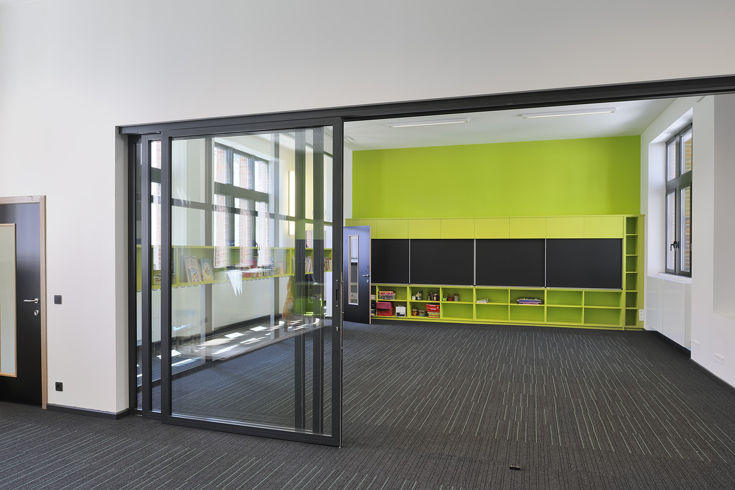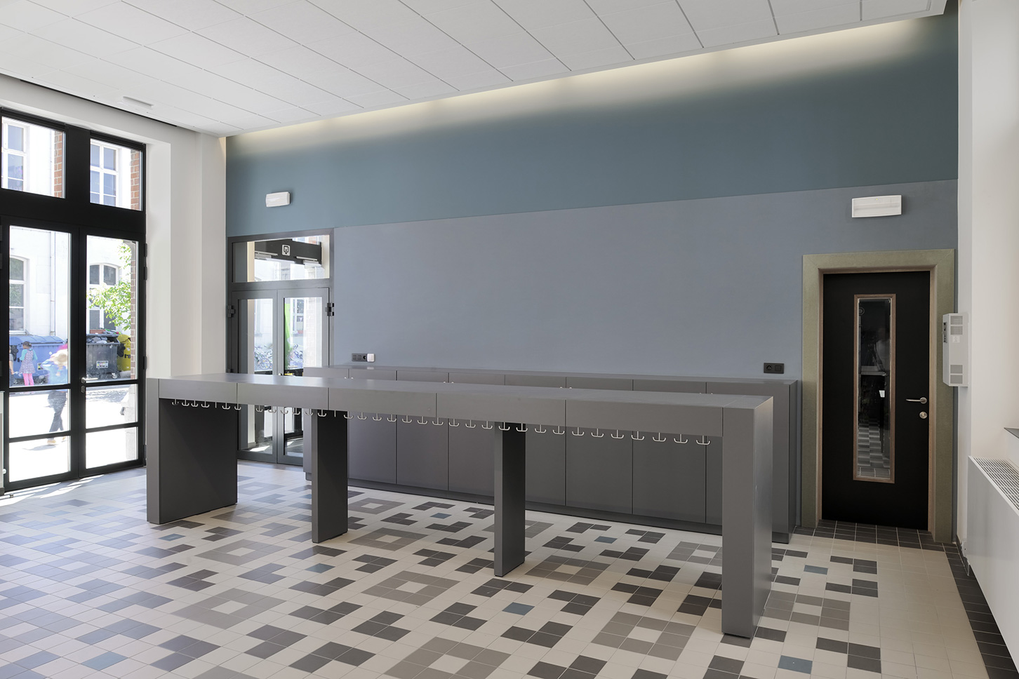 La rénovation du bâtiment existant avait notamment pour but de remettre en état la façade historique de grande valeur. Les espaces intérieurs ont également été repensés de manière contemporaine, avec une petite note ludique. Les couleurs du tapis se retrouvent sur les armoires murales. Une palette de coloris différente a été choisie pour chaque étage. Deux classes voisines peuvent être reliées visuellement et effectivement pour organiser des activités interclasses.