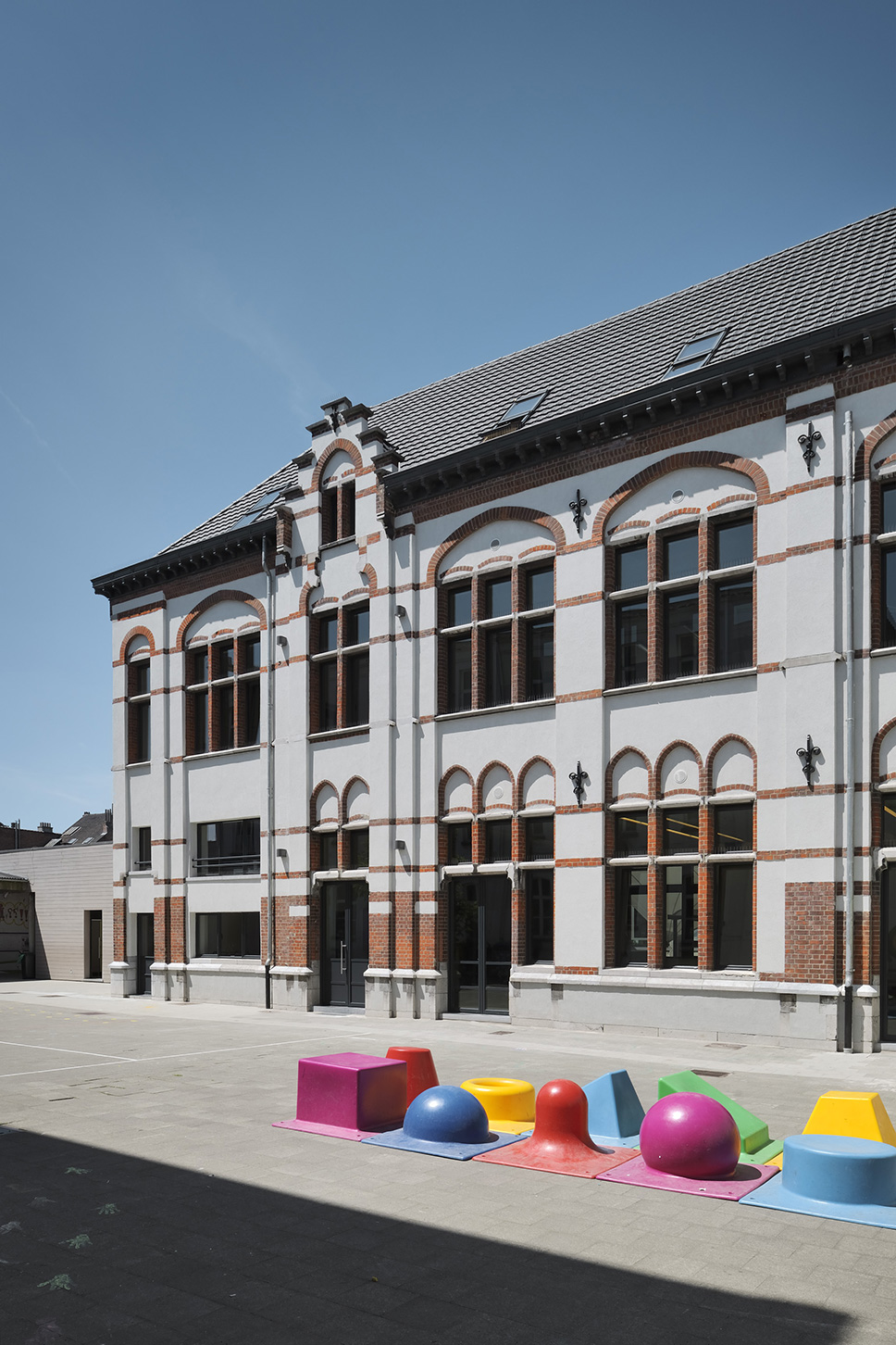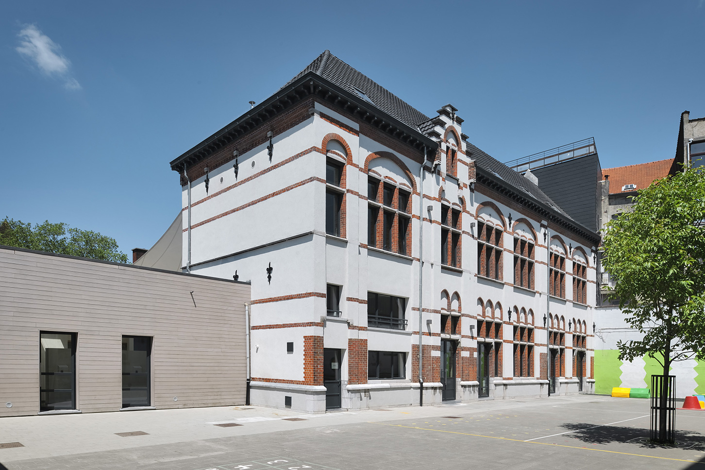 Un bâtiment existant de grande valeur, datant de 1895, est complètement rénové et équipé de tout le confort moderne. Pour obtenir une grande cour de récréation, un deuxième bâtiment a été démoli et remplacé par une nouvelle construction érigée à un autre endroit.