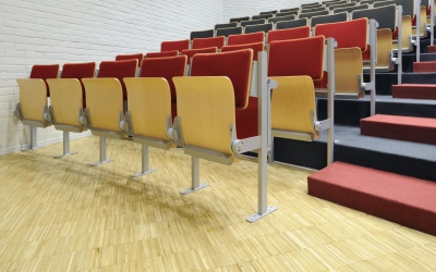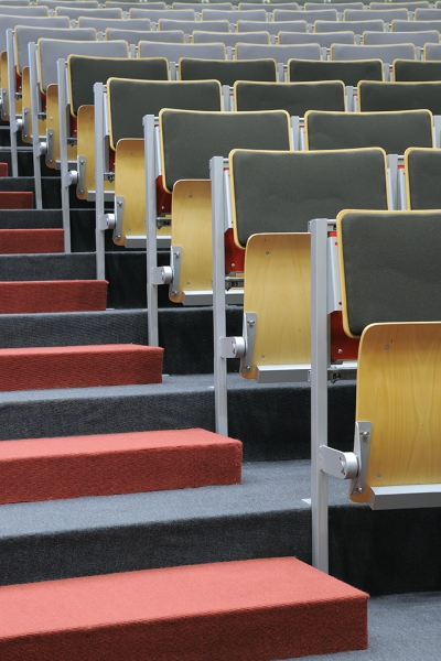 Et pour terminer, l’aula a été complètement rafraîchie et son équipement technique actualisé. En accordant toute l’attention nécessaire à l’acoustique et à l’éclairage, on a créé un endroit idéal pour des conférences. Le mobilier original relativement lourd a été remplacé par des sièges tendus de tissu dotés de bonnes propriétés acoustiques et agréablement confortables. Les murs en briques brunes existants ont été peints en une nuance plus claire, de façon à ce que les esprits restent concentrés sur les conférences.