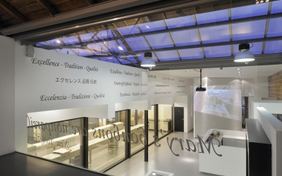 Pour ce projet, DEWIL architectes a voulu souligner l’aspect industriel du bâtiment et conserver autant que possible le caractère ouvert des espaces. De là l’installation de nombreuses cloisons en verre. Une grande porte pivotante donne accès aux salles d’exposition. Ici les visiteurs découvrent le processus de production et un certain nombre d’éléments anciens comme les traverses originales en acier.