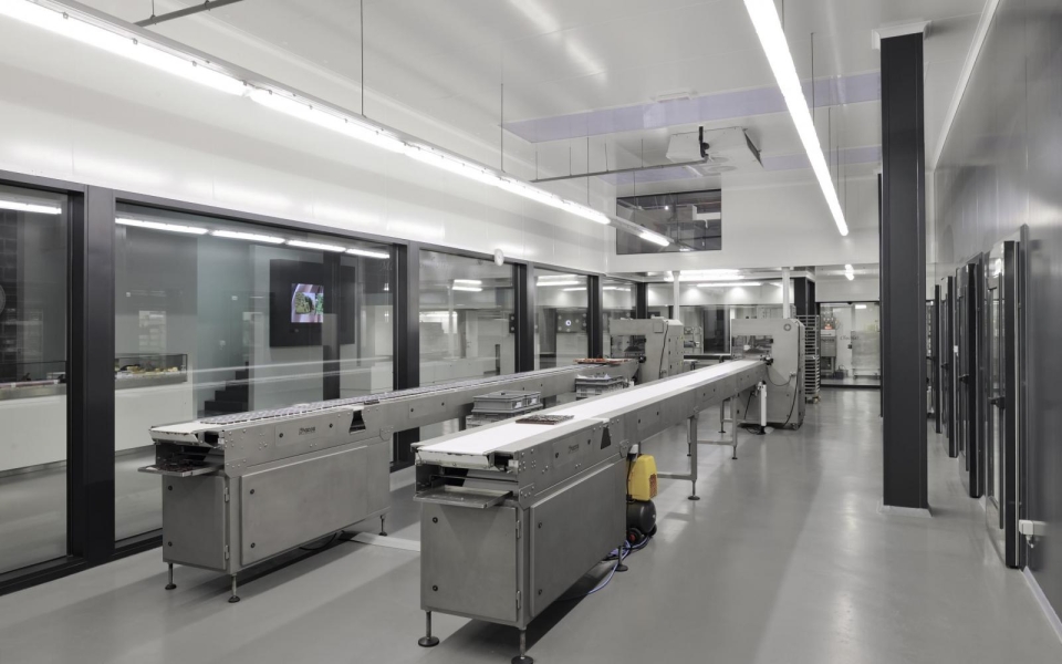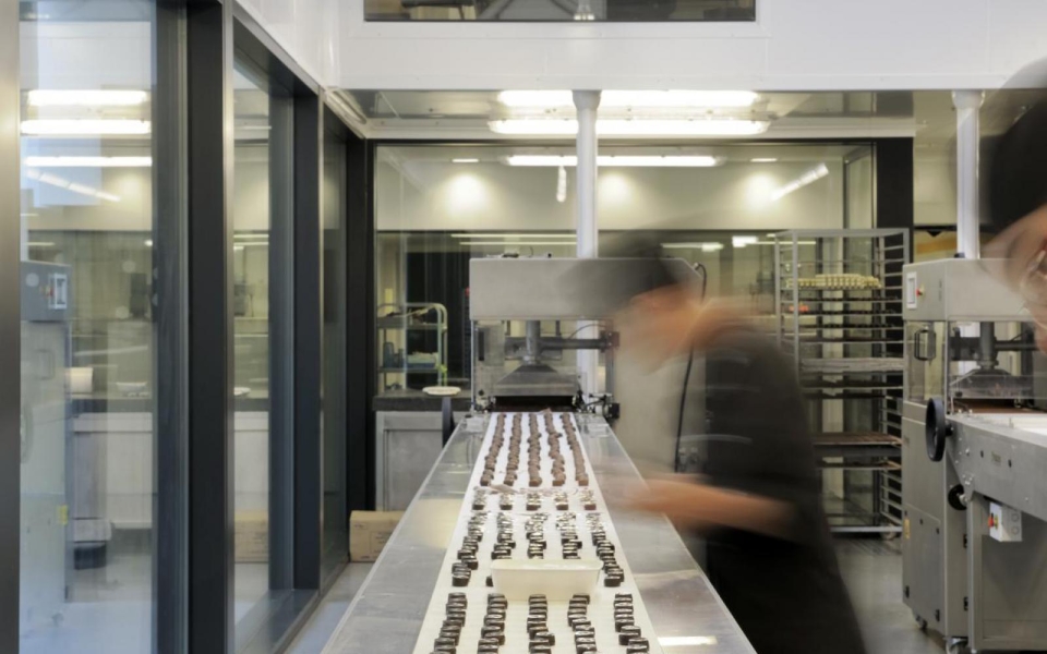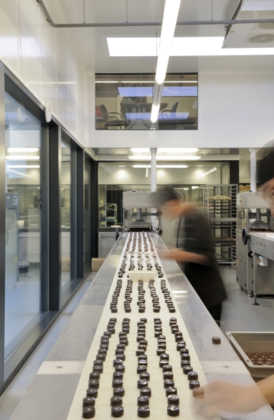 Dans les ateliers par contre, la structure de toit originale n’a pas pu être conservée. Comme une température constante de 15° C doit être maintenue dans ces espaces pour des raisons techniques et hygiéniques, ils sont complètement isolés et séparés des espaces d’exposition. Et il fut également tenu compte des normes HACCP sévères pour les flux de production (zones propres et zones sales).
