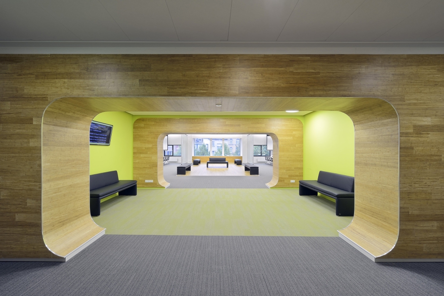 Les espaces techniques existants au centre du bâtiment sont revêtus, comme un meuble, de placage bambou qui ajoute une note chaleureuse à l’intérieur. On retrouve le même matériau dans le foyer central qui traverse le mobilier technique. L’emploi des coloris et les armatures lumineuses rondes, implantées de façon ludique, créent une ambiance plus intime.