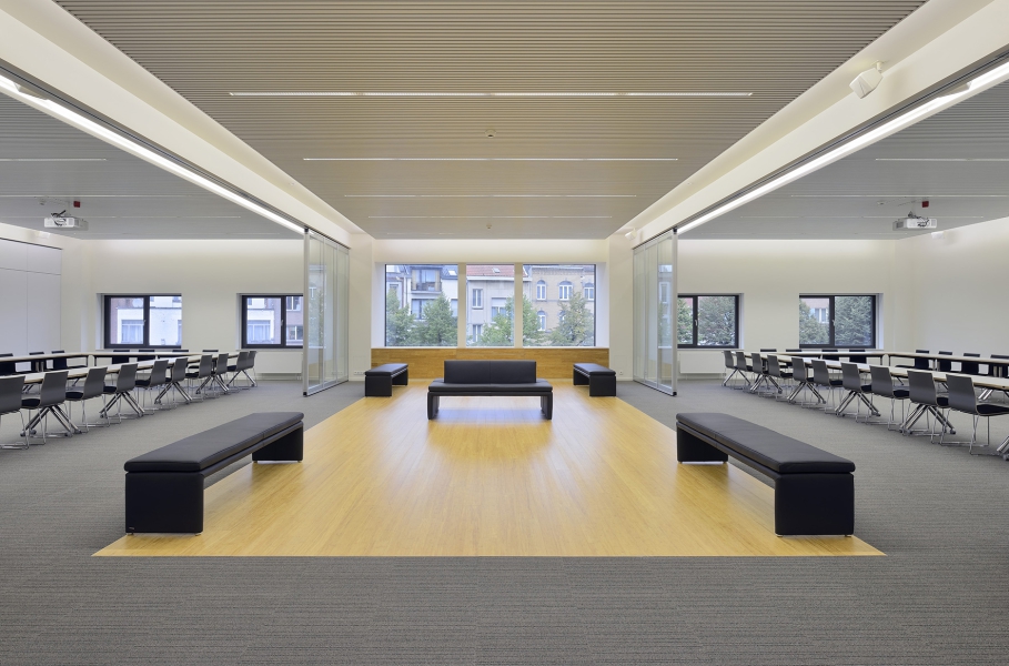 Les techniques ont été adaptées en profondeur. Chaque salle est équipée d’une table technique pour les commandes des éclairages, occultations et projections adaptés à la configuration de la salle. Un plafond froid innovant garantit un climat intérieur agréable et contribue au confort acoustique. Les exigences techniques et acoustiques pour les salles de réunion sont en ligne avec la qualité architecturale et esthétique du concept global.