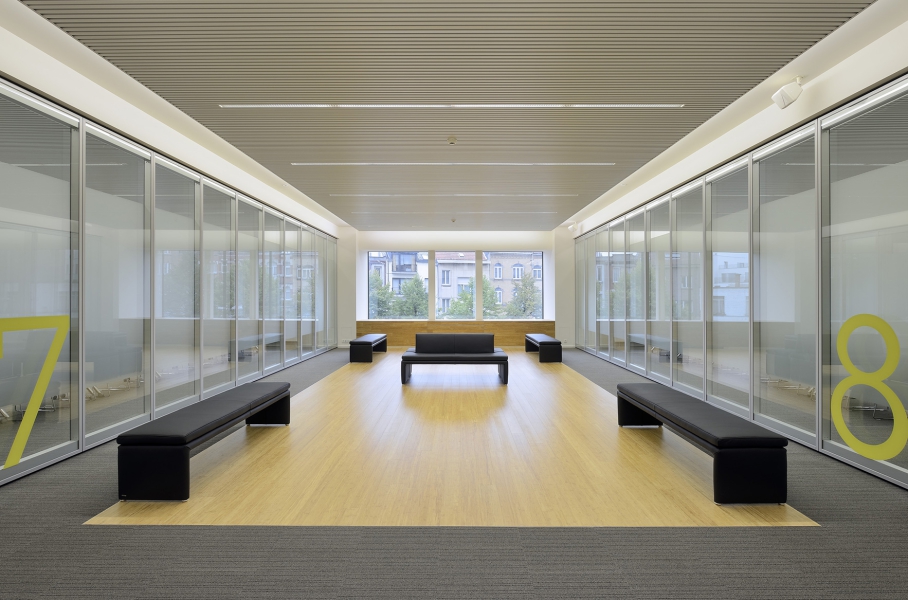 Dans un ancien bureau paysagé de la Maison du Travail asbl, DEWIL architectes a aménagé des salles de réunion et un foyer. Le principal défi du projet consistait à faire pénétrer la lumière du jour dans les nouvelles salles de réunion. La lumière naturelle pénètre librement par un nouveau foyer central qui assure la jonction avec les salles de réunion existantes de l’autre côté du bâtiment.