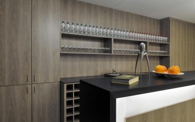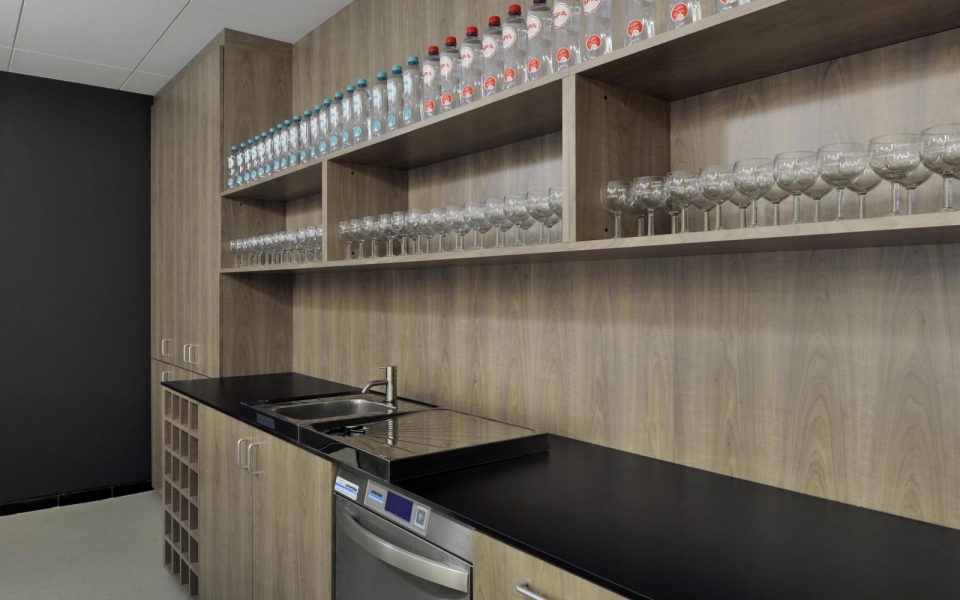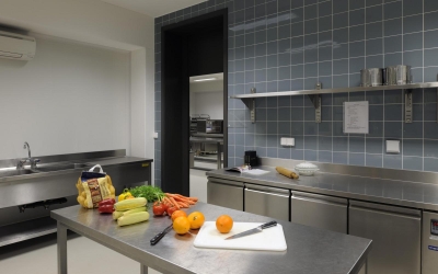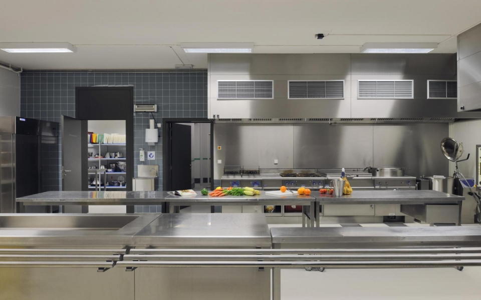 Le projet comporte l’installation de plusieurs cuisines pour des préparations chaudes et froides, différentes chambres froides, un réfectoire/restaurant et un restaurant didactique. Le réfectoire et le restaurant se trouvent au rez-de-chaussée du bâtiment V. Les cuisines et locaux adjacents ont trouvé place dans une extension préfabriquée.