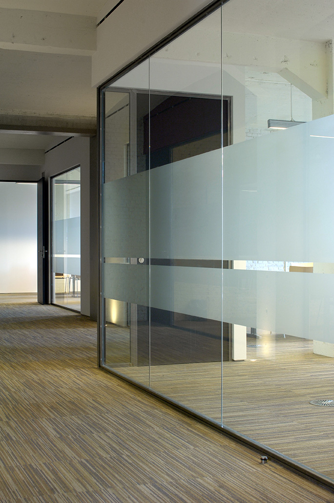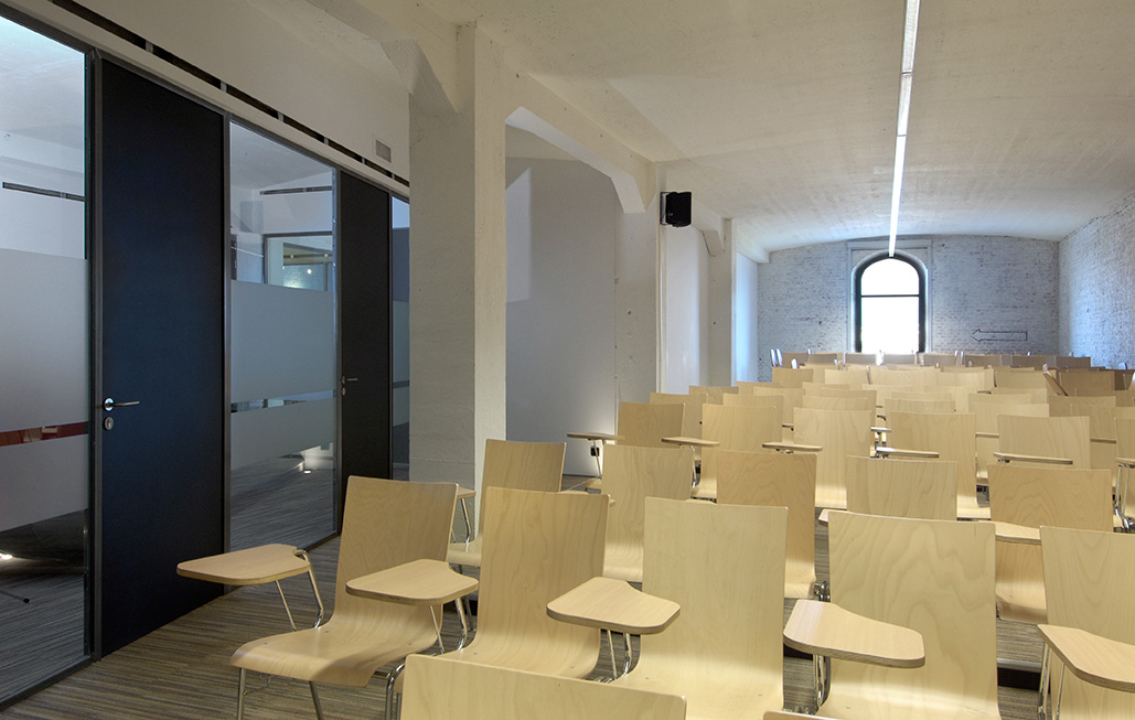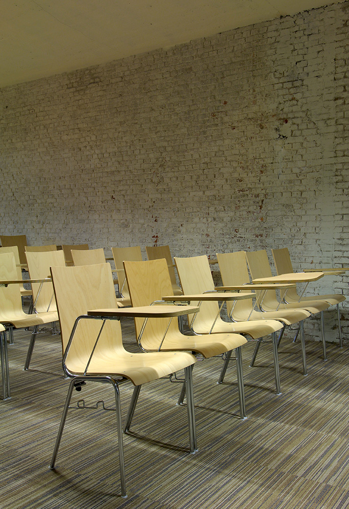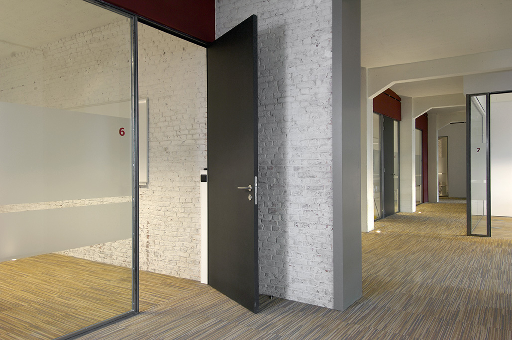 Trois modules de Syntra Bruxelles, installés au deuxième étage de l’Entrepôt royal de Tour et Taxis ont été aménagés en locaux de cours, salles informatiques, auditorium, secrétariat, salles de réunion et bureaux. Des interventions placées sous le signe du respect de l’environnement original et du caractère authentique du bâtiment. On ne pouvait donc toucher ni aux murs, ni aux colonnes, ni au plafond ni à la menuiserie extérieure.