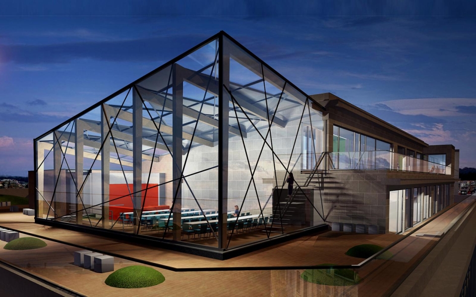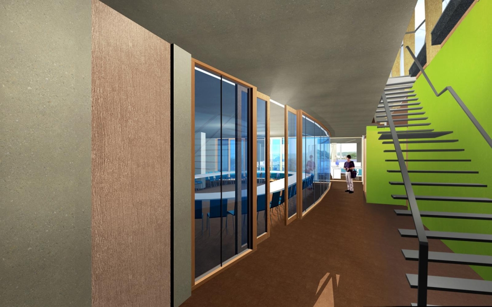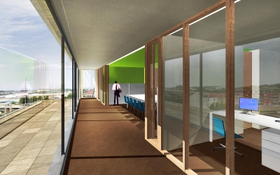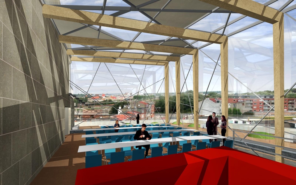 Trois plateaux existants au quatrième, cinquième et sixième étage ont été complètement démantelés et réaménagés. Un passage couvert est construit entre le quatrième étage du bâtiment principal et le parking qui se trouve à l’arrière. Au cinquième étage, le bâtiment s’agrandit d’une cafétéria installée dans un volume en verre de caractère panoramique.