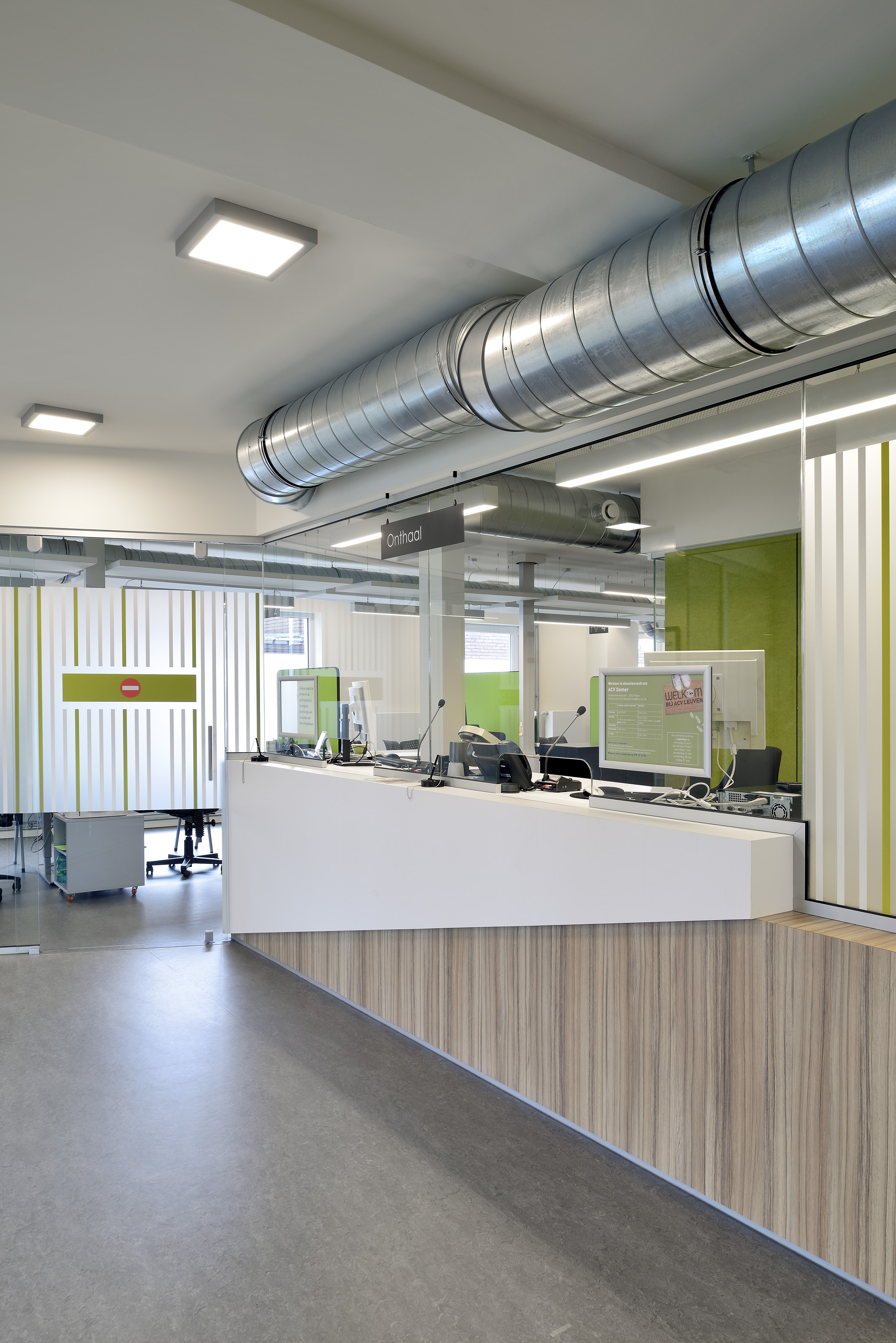 DEWIL architecten werd aangesproken om in een oud winkelpand een dienstencentrum in te richten met twee ontaalloketten, 8 burelen, een back-office, sanitair en een cafetaria.