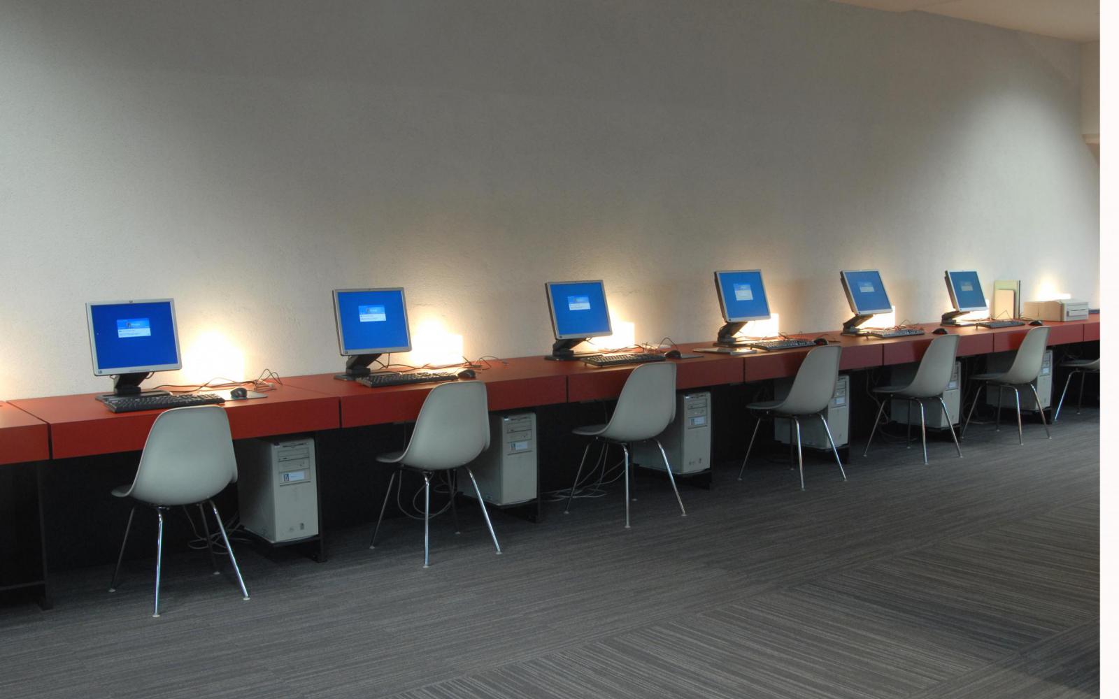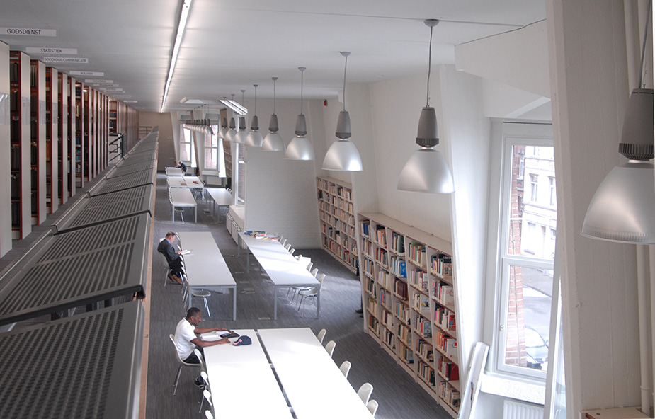 Met het oog op de hedendaagse noden van studenten en een flexibel gebruik is de bibliotheekinrichting opgevat als een actief leerlandschap. Op twee computereilanden in de leeszaal kunnen studenten met hun draagbare computer rechtstreeks inloggen op het netwerk van de bibliotheek. Daarnaast beschikken ze over grote tafels die ze door middel van tussenschotten kunnen omvormen tot individuele werkplekken. Naast de stille leeszaal is er aan de zijde van de balie een tweede zone gereserveerd voor groepswerk en colleges.